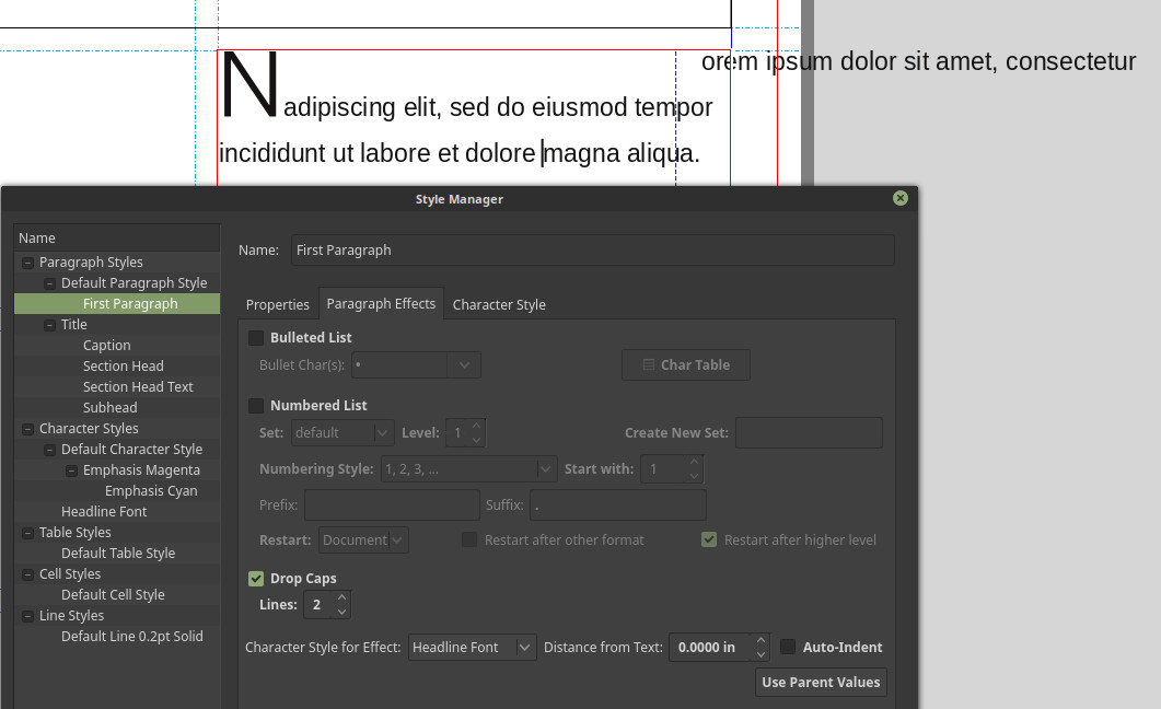 | Steps To Reproduce | Turn on drop caps in a style, select character style to use for the leading character. | ||||