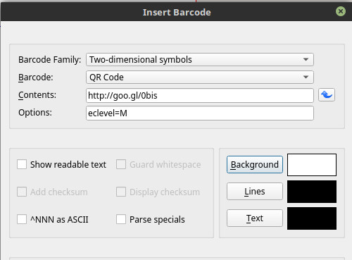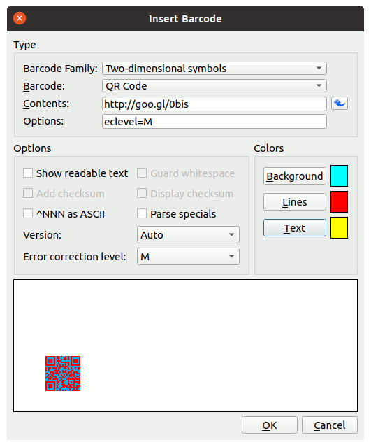 | Description | If you change many times the color in "Insert Barcode" window, the window is grow 1. Open new document 2. Click "InsertBarcode" tool in Tool 3. Choose: Barcode family: Twosdimensional symbols -- Barcode: QR code (or anything) 4. Click: Lines, Background or Text buttons 5. Click the OK in Colours and Fill window Repeat it many times 4. and 5. | ||||