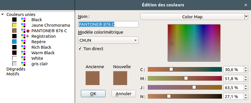 | Description | I'm working on a document which uses a Pantone spot color (5 colors in total : CMYK + spot color). When I check the color separations in the print preview, I can see CMYK colors just fine, but not the spot color. I've joined a sample and a few screenshots. The spot color is the brownish one. ton_direct_color_config.png : spot color configuration ton_direct_edit.png : preview of the document ton_direct_preview_cmjn : color separation for CMYK colors ton_direct_preview_pantone : color separation for the spot color I've worked on this document for a few years now, and the color separation worked juste fine previously (that is 3 years ago on Scribus 1.5-trunk). I also recall I could see the spot color in the print preview. Now I don't know if this is just a preview bug, or a more serious bug affecting the color separation for spot colors. Should I be worried that the color separation will fail when we'll send the document for printing ? Regards | ||||