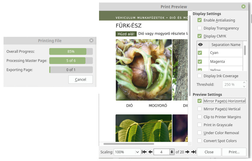 | Description | -- Open new document -- I made 10×10 text frame on the canvas -- File - Print preview - (ignore errors) - You use the "Preview Settings" switches Result: some "Preview printing" window and cannot be close these | ||||