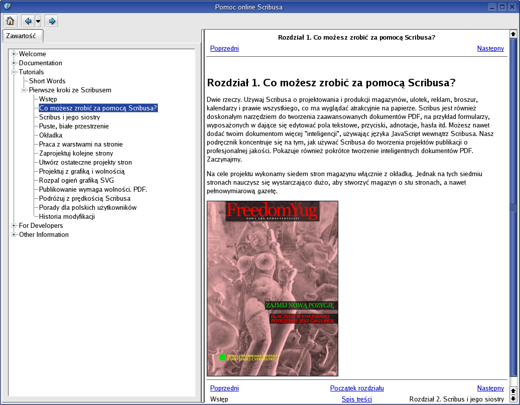| Description | I don't know where to put it on the Scribus website (a "Tutorials" category under "Downloads" is badly needed), so there is a package with an extended Polish version of the Freedomyug tutorial and the localised version of the sample files: http://linux.hanski.info/static/download/freedomyug_pl.tar.bz2 The tutorial is to be viewed inside the Scribus' help browser (thanks to Craig, see bug 830). It looks and works fine enough (see screen shot), even the previous/next links work properly. I encourage Polish users in the README file to install it under $prefix/share/scribus/doc/en/tutorials/* , to have both the English official documentation and this Polish tutorial in one place, without switching the languages. | ||||