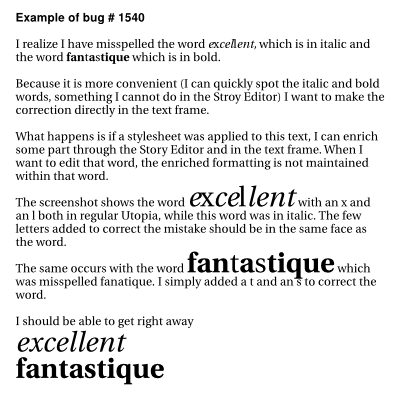 | Description | Say you have a text that includes some words in italic or bold. You want to edit those emphasized words. From within Scribus, there are 3 ways to do that. 1. You edit directly into the text frame 2. You use the Story Editor 3. You use the Search/Replace dialog Also, there are 2 ways to format the text 1. Freely format text 2. Use stylesheet The issue occurs while using the stylesheets. Once you try to edit your emphasized text, you will discover that while using Story Editor and/or Search/Replace, all will be fine and the editing process really straight forward. But when you edit directly in the text frame, which is lots more convenient for that kind of last-minute-editing, the new text retains the formatting of the style sheet no matter if you add a letter or type on a selected one. | ||||