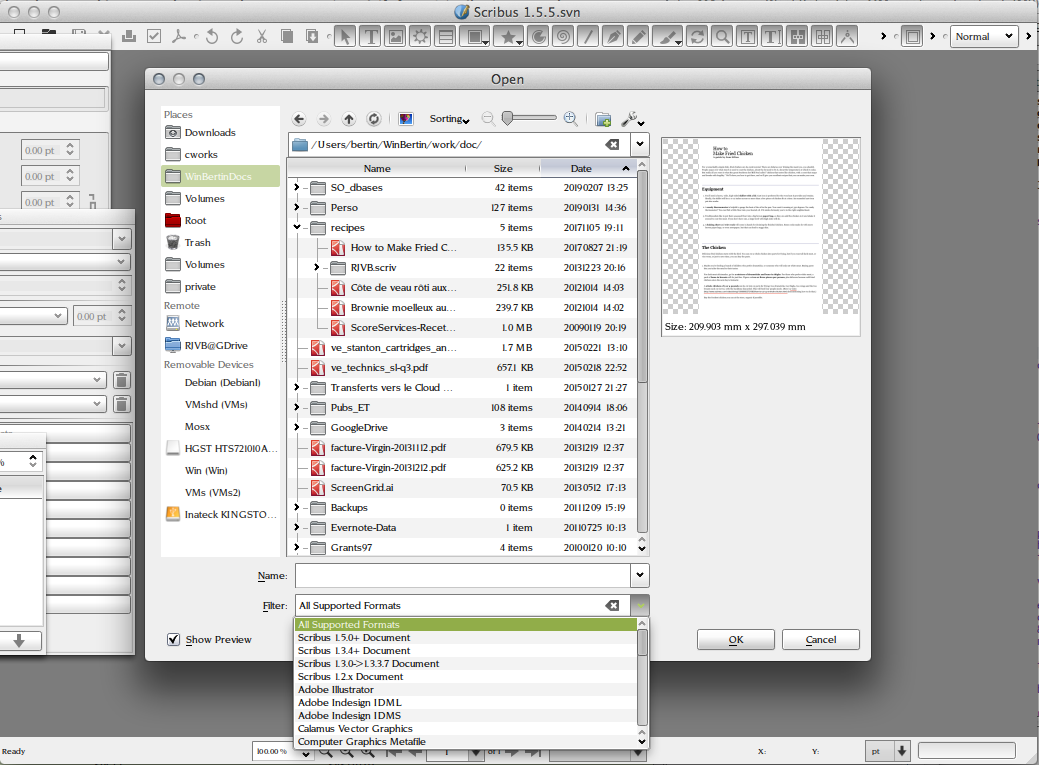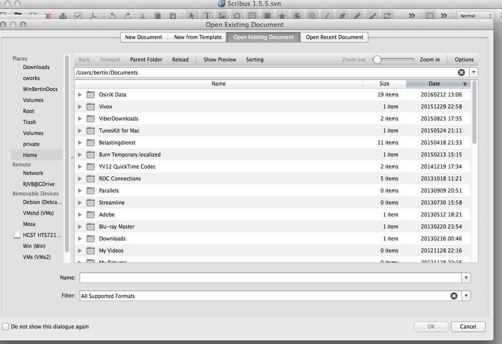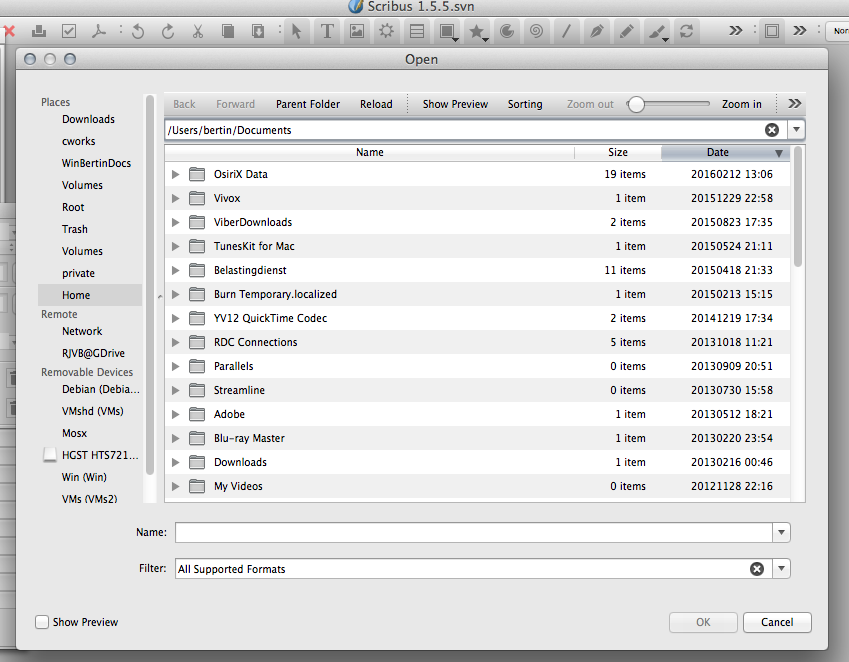 Here's a working patch that provides a file dialog that is based on `KFileWidget` from the KIO framework, which is core of the KDE file dialog. The patch is a bit rough around the edges; I haven't yet implemented the CMake logic that will allow the build to complete when KIO isn't available. (I've also not tried very hard to use the proper coding style.) With this approach we get a very feature-rich file dialog that should work everywhere; screenshots made on Mac attached. This patch was made against the 1.5.5 series, checked out from Git (#b0a8577cd8aee7702823b2c1b080bcc0db5dea54). I'd love to hear from Scribus team members what they think of integrating this patch (and how much work it'd require...) patch-use-kfilewidget.diff (23,809 bytes)