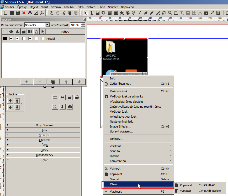 | Steps To Reproduce | In Scribus prepare a frame with an image or text. Next to it make another frame, empty. Using shortcuts Ctrl + Shift + C/V/Delete (according your version, see context menu on the filled object, item "Content") transfer the content. |