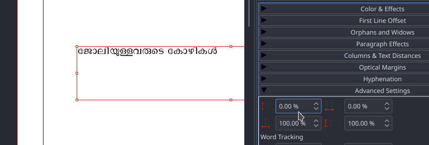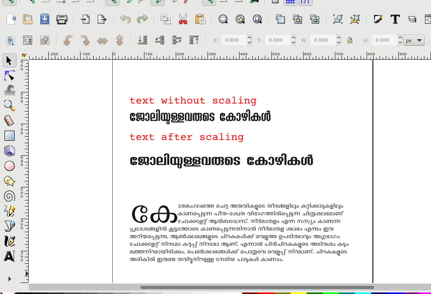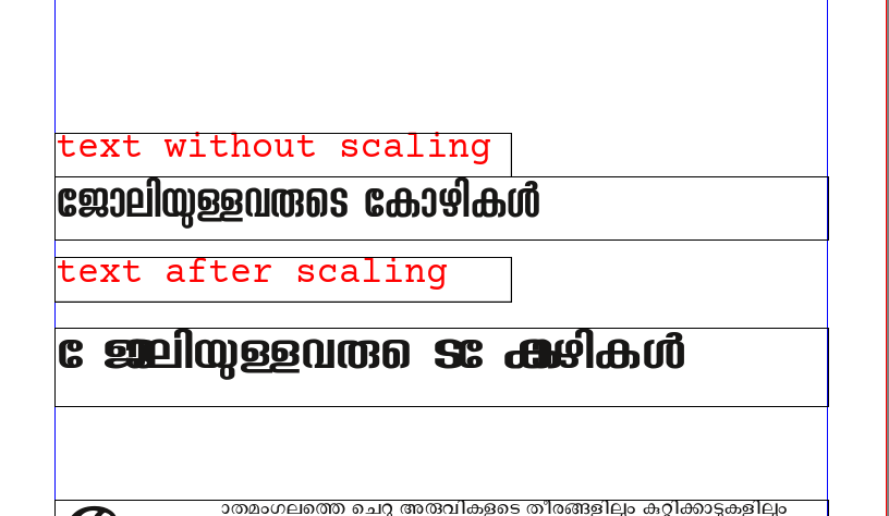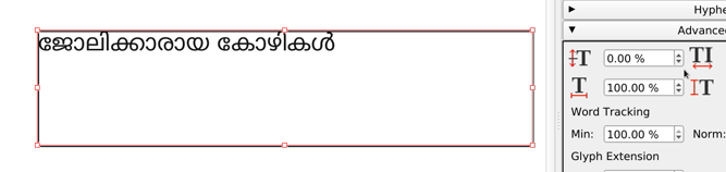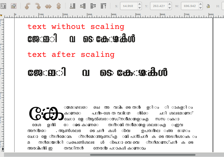 | Steps To Reproduce | ജോലിക്കാരായ കോഴികള് copy the above text to scribus select any font from http://smc.org.in/fonts or use Noto Sans Malayalam adjust the scaling width from advanced settings under text properties | ||||