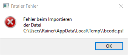 | Summary | 0015782: Fataler Fehler - Fehler beim Importieren der Datei C:\Users\xxx\AppData\Local\Temp\\bcode.ps! | ||||