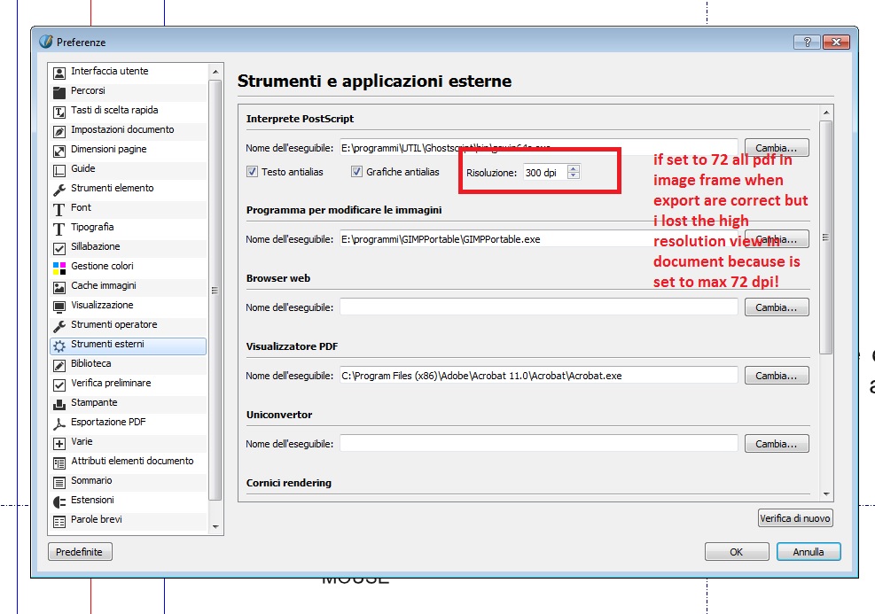 | Description | i see all correct but when i export to pdf the image frames in which i load pdf are wrong because has wrong scale, in preferences as the image i attach, if set to 72 all pdf in image frame when export are correct but i lost the high resolution view in document because is set to max 72 dpi! so I come to the conclusion that in external tools -> applications where there is postscript interpreter dpi pref. if I put the resolution over 72 dpi then I export everything is wrong. ususally i set postscript interpreter 300 dpi i see all pdf in image frames correct but when export to pdf is a mistake. | ||||
