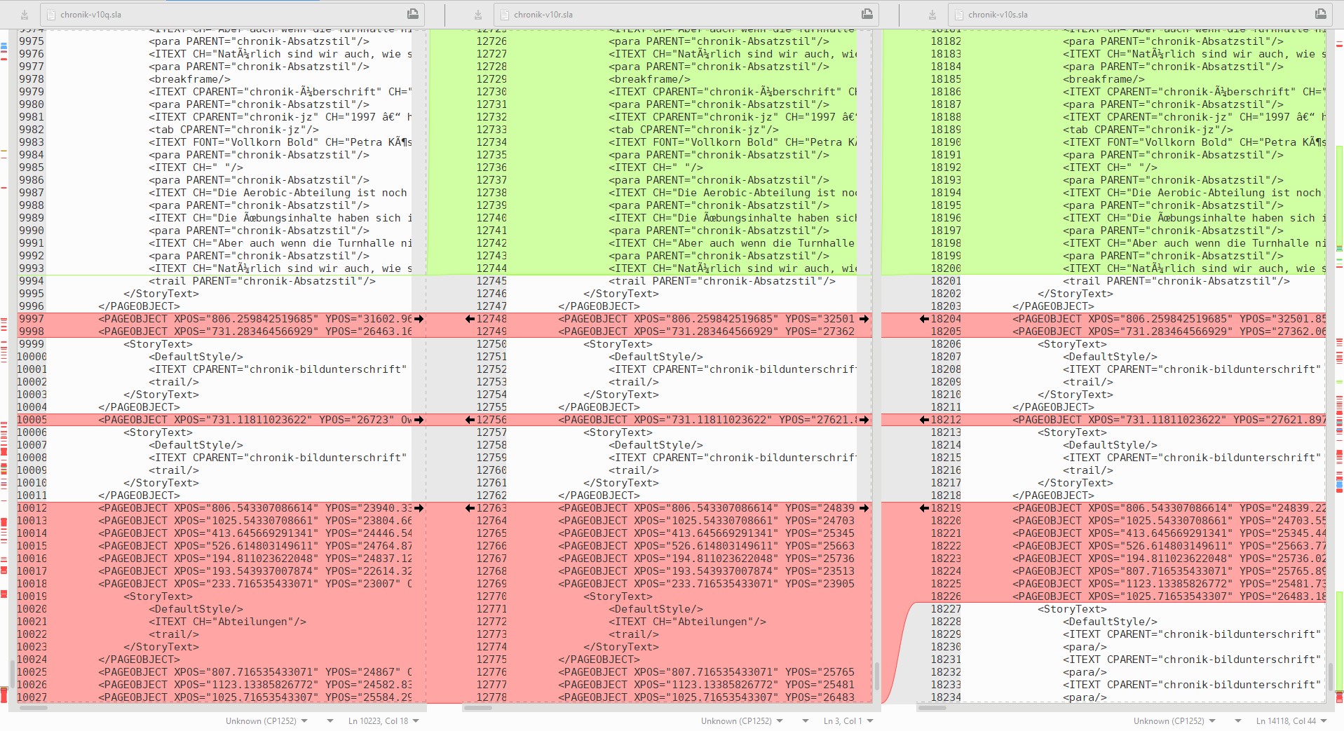 | Description | the file size of my document did increase every time - now a document with some 120 pages has a size of the sla of 9.3MB which results in loading time of about 15 minutes and a memory load once done of 3.2GB the size increased first slowly, with the latest savings in larger steps (I'm kind of sure not to bind pictures to the document, thus e.g. the latest changes mainly doing hyphenation and few pictures should come with this change in size): 27.10.2019 20:22 683.260 chronik-v10e.sla 29.10.2019 20:27 694.485 chronik-v10f.sla 29.10.2019 21:15 720.003 chronik-v10g.sla 29.10.2019 22:08 785.058 chronik-v10h.sla 30.10.2019 19:30 792.571 chronik-v10i.sla 30.10.2019 20:52 1.049.818 chronik-v10j.sla 02.11.2019 20:40 1.146.292 chronik-v10n.sla 03.11.2019 20:26 1.235.473 chronik-v10o.sla 03.11.2019 21:13 1.235.492 chronik-v10p.sla 08.11.2019 22:17 1.396.899 chronik-v10q.sla 09.11.2019 20:31 1.672.171 chronik-v10r.sla 09.11.2019 21:55 2.228.425 chronik-v10s.sla 10.11.2019 21:20 3.324.420 chronik-v10t.sla 11.11.2019 20:07 5.488.688 chronik-v10u.sla 11.11.2019 20:58 5.486.438 chronik-v10v.sla 12.11.2019 20:29 9.817.031 chronik-v10w.sla Thus I had done a 3-way comparison of the sla version q/r/s - and to me it looks like a large block is being added again and again (recursion?) | ||||