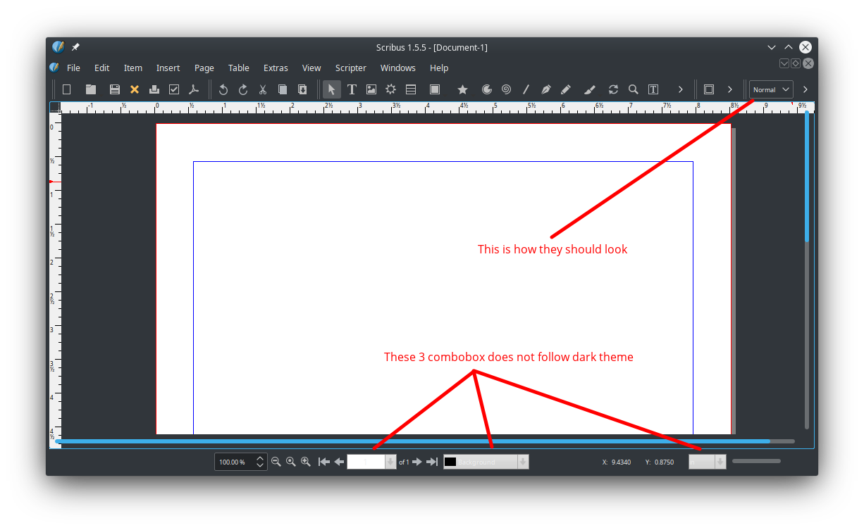 I have fixed the scribus.css so that it lets the status bar comboboxes follow the selected theme. If Scribus is running while theme is changed, it might however be needed to restart Scribus. |