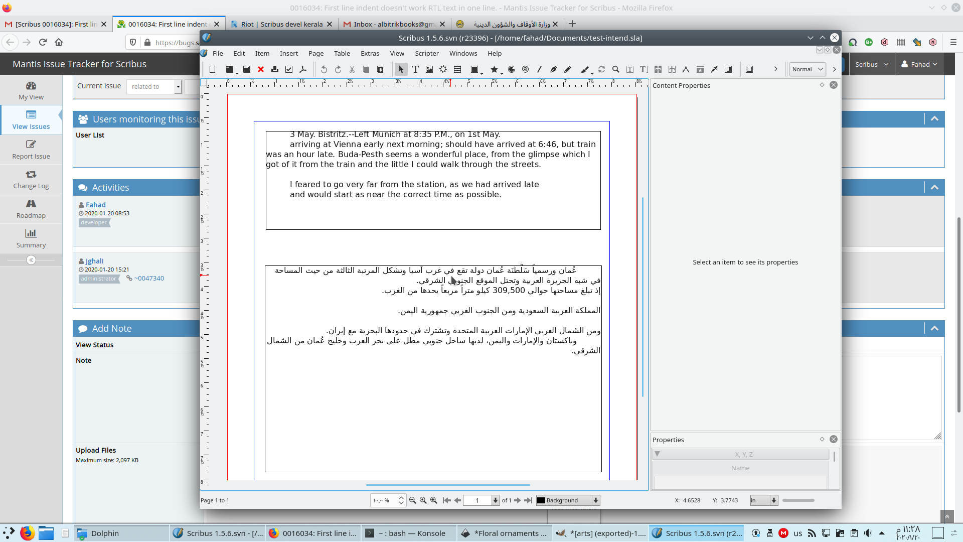 Thanks. When opening your document, I replaced the DejaVu Sans Book by Arial as I didn't have this font on my system. It then occured to me your patch was incomplete as in my case the first line indent was still not applied to the last paragraph. I had to modify line 2851 of pageitem_textframe.cpp in the same way you did with line 2480.