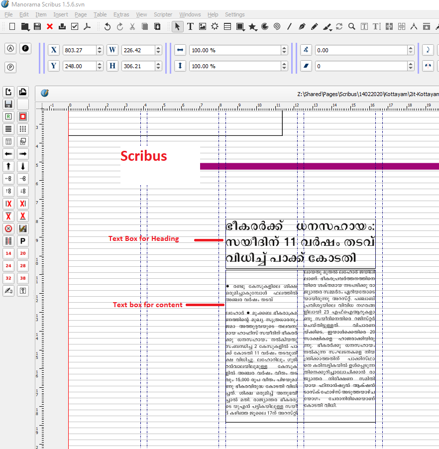 Suppose I have a text frame which is splitted to 5 columns. I want to add a headline to 5 column content which will cover the 5 columns. In scribus, now, I have to create another text frame to type the headline and set the style then adjust the text frame to 2 columns. Then I have to group both the frames to make it bounded. I have attached images of both scribus and Indesign. |
