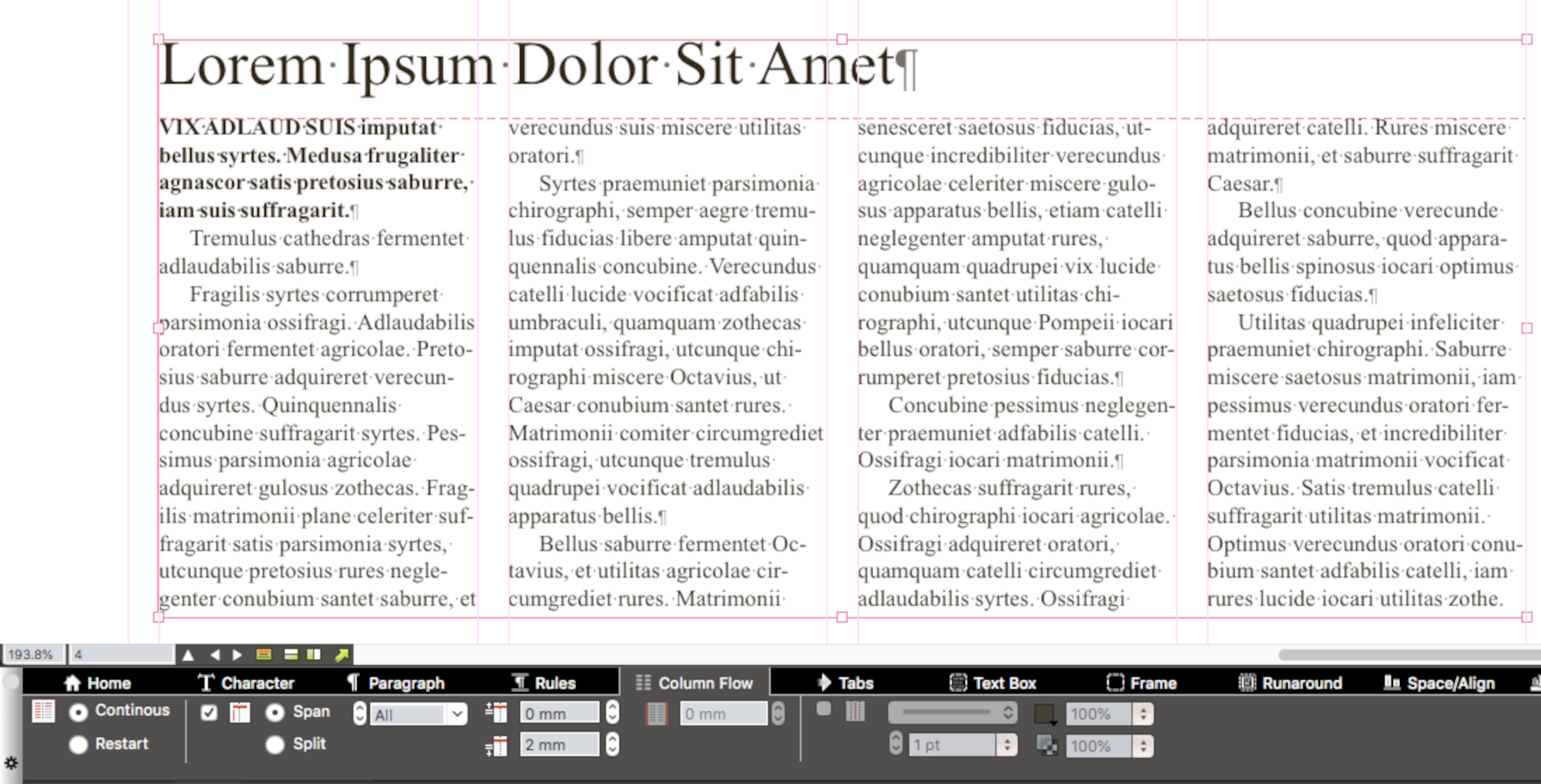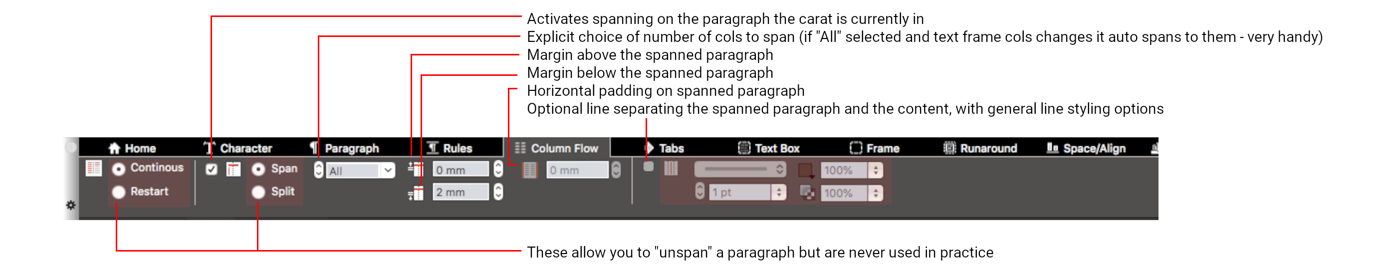 Yes @nitramr you can span any paragraph in the text frame but typically in newsprint publications this is just the first/second paragraph (for a headline and/or drop head) and this matches our use case -- and seemingly the use case of @sreerajp who originally opened the issue. There are lots of other features offered by column flow in QXP which we just don't require, but they could be useful for others. I've had a play with the weld features and it's still not quite right for this use case. It takes a lot of manual steps to accomplish what QXP/ID do. Although we can achieve the same result, the key is being able to achieve it quickly with minimal clicks. It's hard to overstate exactly how useful this feature is for real-world publishing productivity. I would also draw to attention that the Column Flow feature is just the 4th tab to the right in the QXP toolbar because it's that important; listed well before things even like frame settings, run around, and alignment. This feature actually halves the time it takes to do a real-world layouts. |