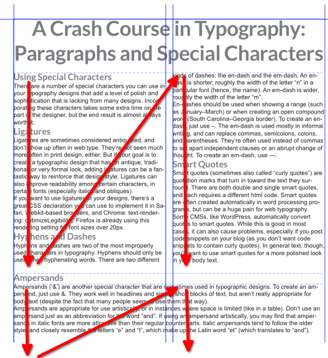 I'm glad you agree that the implementation in QXP (and I suspect ID) is a hot mess. A cautionary tale. Column spanning is an essential feature for story headlines (and subheadings) and basically nothing else. What they allowed the user to do is just ridiculous and they can't even get it right themselves based on how unpredictable the results are and how crashy the app is. I'm in favor of your second option; because being able to tie the span intent in to a style is an productivity power-move. Although I do think the number of columns should be flexible rather than an all-or-nothing approach, the calculations could be simplified by taking this approach: The para height is calculated; [para height] = [margin above] + ([num of cols] * ([width of col] + [width of gutter])) + [margin below] Start the top of the next para at [para height] [col counter] = 0 Begin laying out text in col [col counter] When it wraps, ++[col counter] if [col counter] + 1 <= [num of cols] then Start column y at [para height] else Start column y at 0 endif That will allow the columns flow in this PDF to work quite easily; and allow for subheadings too. p.s., I wonder if another easy approach to code this might be to add a virtual runaround to the areas where the para spans multiple columns as if it was a text frame above it? |