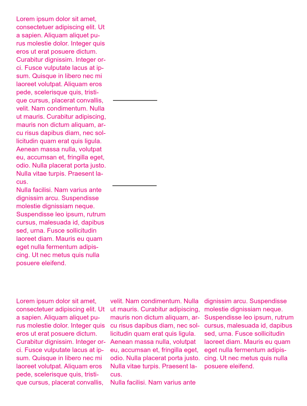Wow @nitramr your examples made my head spin! I struggled to understand what was happening on the pages because nobody would ever create anything like that in real life (probably get fired for doing so haha). I persisted and tried to recreate your PDF in QXP and found nothing but unpredictable behavior and bugs galore. Lots of crashes, lots of confusion, and lots of differences between my document and exported PDFs. A total nightmare for production and would certainly result in angry meetings if somebody was doing this before a deadline. I've come to the conclusion that column flow is very hard, and if Quark can't get it right (and I suspect Adobe also) then there's little hope. I beg the developers, please, do not try and recreate what Quark and ID let users do. I consider this a bug not a feature. The entire text frame looks haywire and going back to my first point, nobody would ever do this in real life. The only actual use case needed by the opening poster (and myself) is to span the first paragraph over all columns. Everything else is totally unnecessary for actual production and would be over-engineered if it supported it. I think to distill what's needed for actual use cases, the simplest implementation logic is: 1. Only spans are allowed (no splits/unspans) 2. A span can be 2-All columns 3. The vertical position of the next paragraph is always below the end of the span, regardless of how many columns it spanned 4. A paragraph style can contain a span property ("All" maps to however many columns are present in the parent text frame) |