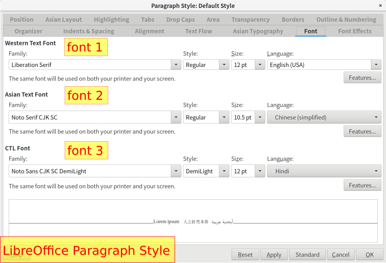 Here are 2 screenshot, one from LibreOffice(paragraph style), another from InDesign(compound font editor). The screenshot from InDesign, I had marked it in English. I like LibreOffice's way. |