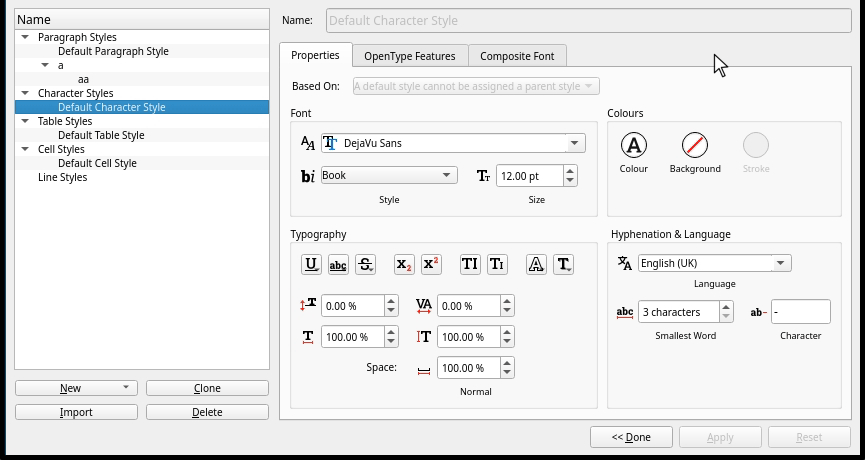 <CHARSTYLE CNAME="Default Character Style" DefaultStyle="1" FONT="DejaVu Sans Book" FONTSIZE="12" FONTFEATURES="" FEATURES="inherit" FCOLOR="Black" FSHADE="100" HyphenWordMin="3" SCOLOR="Black" BGCOLOR="None" BGSHADE="100" SSHADE="100" TXTSHX="5" TXTSHY="-5" TXTOUT="1" TXTULP="-0.1" TXTULW="-0.1" TXTSTP="-0.1" TXTSTW="-0.1" SCALEH="100" SCALEV="100" BASEO="0" KERN="0" LANGUAGE="en_GB"/>