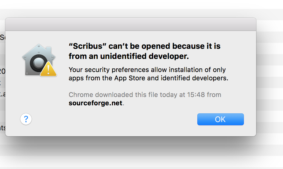 | Description | Hi, I'm trying to download this software on my work MAC laptop, this is the version I've downloading, but it doesn't install: http://sourceforge.net/projects/scribus/files/scribus/1.4.8/ See attached the error I get. How do I install on my work MAC? | ||||