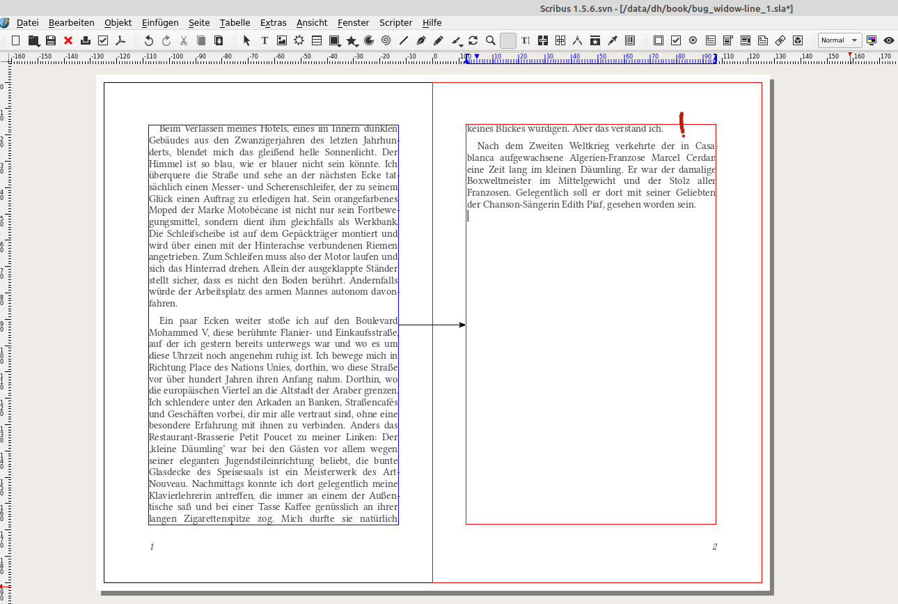 | Steps To Reproduce | Open a new document with two pages Create a full-page text frame in each of the two pages Link the two frames together Fill the frames with a text which is longer than one page and cut it in paragraphs in a manner that the last line of the last paragraph of the first page is coming on the next page. Then you see, that this line is beeing isolated on the top of the second page. | ||||