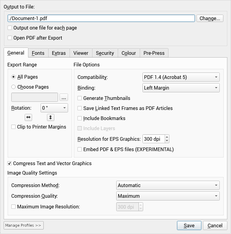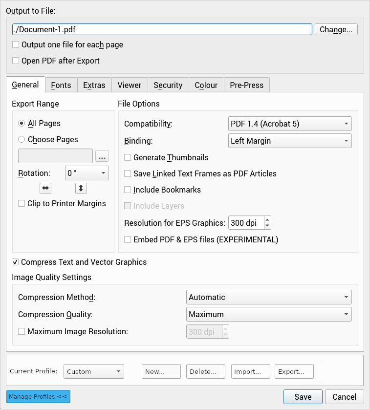 | Description | I think it would be helpful to be able to export Scribus documents from the command line if you have a lot of separate files to be exported (this might save time in some use cases). Since the options for PDF export are too numerous and complex to be configured from the command line, I would suggest to do the configuration using the graphical utility and save the preferences as a profile file, which can then be used as configuration for command-line export. The command line argument could look like this: -e / --export EXPORT_PROFILE Examples: (a) scribus -e "profile_1" "Newspaper_p1.sla" "Newspaper_p2.sla" (b) scribus -e "profile_A" "Article_A.sla" -e "profile_BC" "Article_B.sla" "Article_C.sla" Attached are two quick drafts of how I imagine this profile management in the Export dialogue. Probably it would also need to be added to the PDF Export section in the global and document setting in a similar way. | ||||