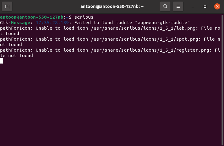 This is the output in the Terminal when I launch Scribus in Ubuntu 20.10. As I mentioned on other forums, GNOME Shell crashes, and Scribus doesn't respond. I have to kill the process to close Scribus. |