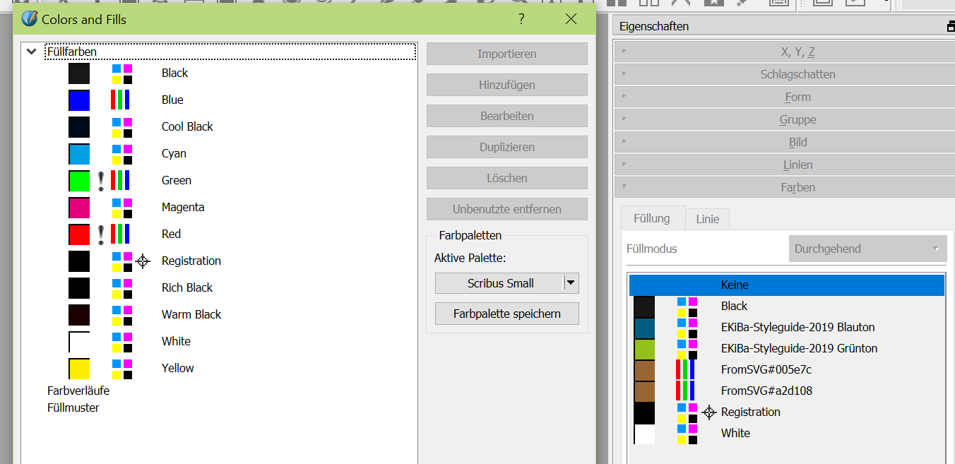 hoi fridolin it's very likely that your problem came from opening the document with scribuses using different UI languages. the fact that you have a None and a Keine color supports this supposition. this type of bugs have happened regularly in the past. many have been patched. but the only real solution is to separate what scribus shows to the user (the translated name for the colors) and what it uses internally (the keys). currently it's not the case and, when a document is opened in a different language, there is some risk that an error happens. i guess you are comfortable with the name not being perfectly translated, but you really don't want scribus to mess with the colors that are applied in your document. don't you? the colors are not the only resources that get translated but they are the only for the colors this leads to a visible visible glitch. we have no idea, what happens (if anything happens) with the styles, master pages, and other resources that have a translatable name! anyway, my comment started with "dear team", so the note was not directed to you... but to the one who have a say on the direction that this program will have in the future. |