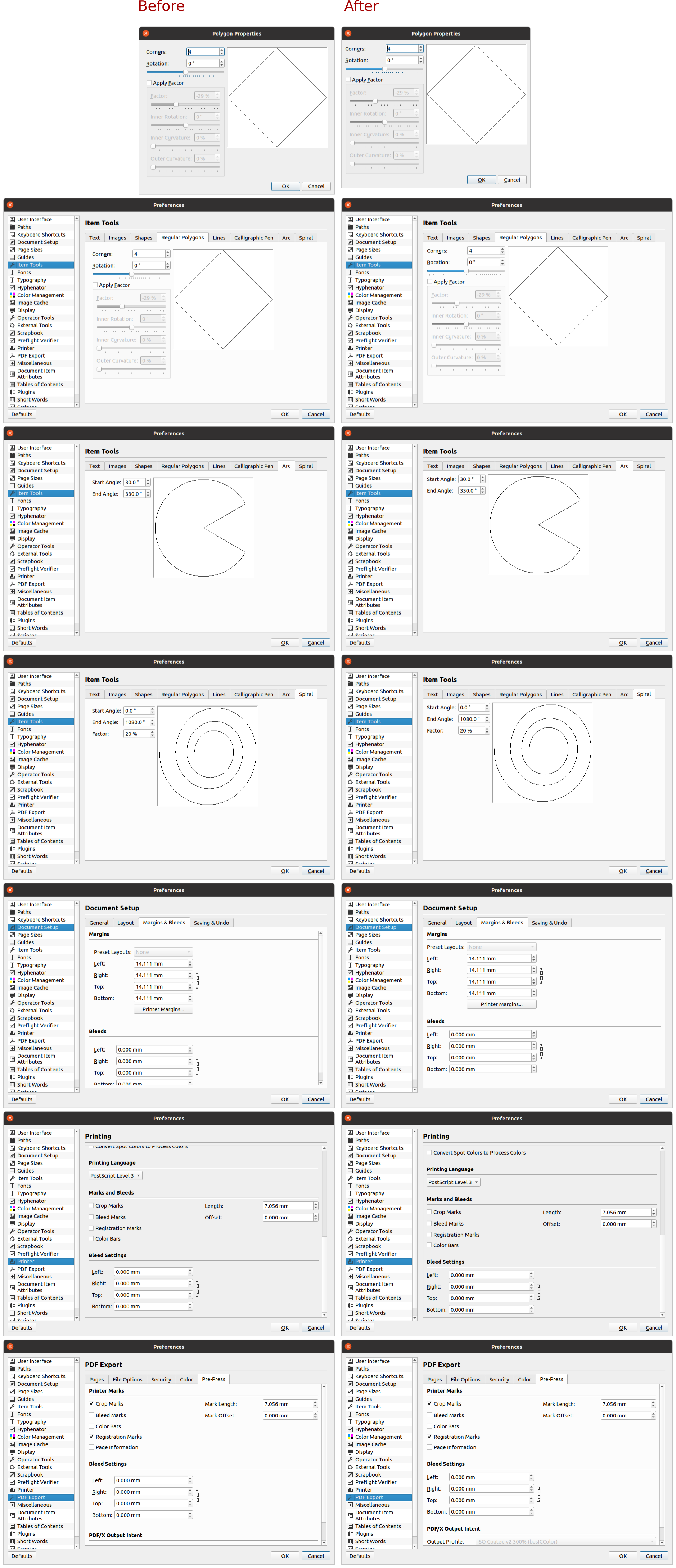| Description | In Preferences dialog in general there are no margins around the elements. But there are some inserted external custom widgets witch has own margins and therefore we get finally double margins: - Preferences / Item Tools / Regular Polygons - Preferences / Item Tools / Arc - Preferences / Item Tools / Spiral As I see Arc and Spiral widget is used just once. But Polygon widget is used in Preferences dialog and in Insert > Polygon > Properties... This interface is affected by double margin issue. Margin (and Bleed) widget is inserted 3 times in Preferences dialog: - Preferences > Document Setup > Margins and Bleeds (there is an additional extra 3th margin.) - Preferences > Printer - Preferences > PDF Export > Pre-press This patch removes all mentioned margins. Please, review the patch. Thanks! | ||||
