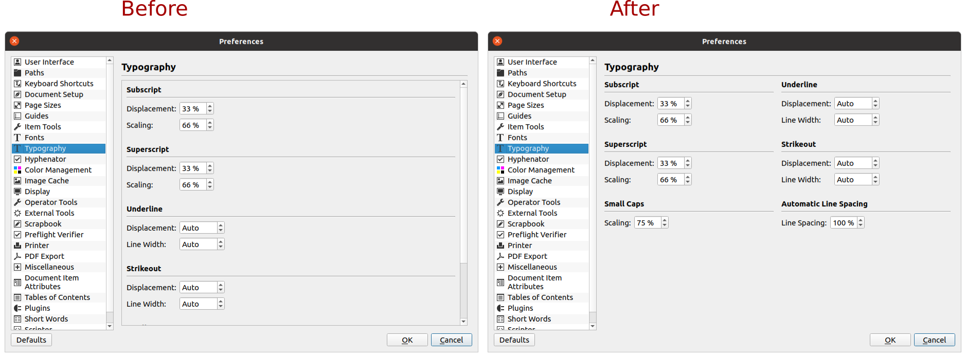 | Description | With 0016367 I finished trivial small improvements in Preferences dialog. This time I try to do something non trivial. It is just an experiment and I need your comments, reaction. I try to avoid scrollable interfaces in Preferences dialog because I think a clear user interface is more usable, user can faster work with it. I choose first time the Typography panel. I tried to rearrange it into two columns. See my proposal below. I did not find any Human Interface Guide for Scribus. Are we following one? Please let me know if yes or your HIG preferences. Can we use two columns? Craig, Jean, please let me know if you are not open for such patches... or the direction is wrong... or quality is poor. I'm not a professional. I never used before Qt Designer. I want to help, but if my patches bother you, I won’t continue :-). | ||||