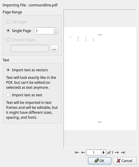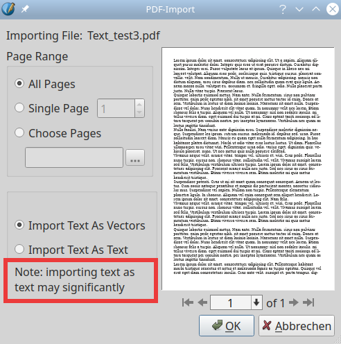 This looks much better now, but I'm not sure that it is the best solution. Perhaps we should make the note shorter and use the warning sign icon instead of the word "Note"? The text would then be something like: "This option may result in problems with layouts involving text." There should also be a tooltip for the text import checkbox: "Text import only works reliably in terms of preserving the original layout if the fonts used in a PDF file are either embedded or installed on your computer. Moreover, the import quality depends on the way the PDF file has been created and the version and/or subset of it. You'll probably need to experiment a bit to find out what's the best way to import PDFs with editable text." |