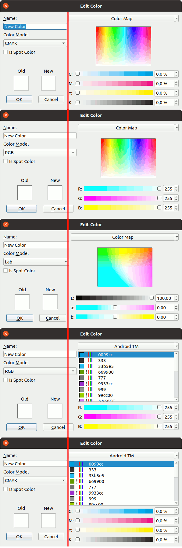 | Description | In this patch I propose a visual update for Edit Colors dialog (Edit > Colors and Fills > Add/Edit/Duplicate). I want to prevent layout trembling. Please see the attached screenshot. Modifications: 1) Stop dialog layout trembling: - Set minimum size for color slider's spinbox - Set minimum size for color slider's label - Reorganize spacers to move color map to the top and sliders to the bottom 2) Use standard margins and spacing: - Remove huge spacing around OK and Cancel button and use spacers around them Please review the patch. Thanks. | ||||