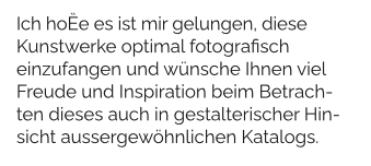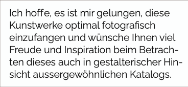 <ITEXT FONTSIZE="9" FONTFEATURES="" CH="Ich hoffe es ist mir gelungen, diese Kunstwerke optimal fotografisch einzufangen und wünsche Ihnen viel Freude und Inspiration beim Betrach-ten dieses auch in gestalterischer Hinsicht aussergewöhnlichen Katalogs."/>