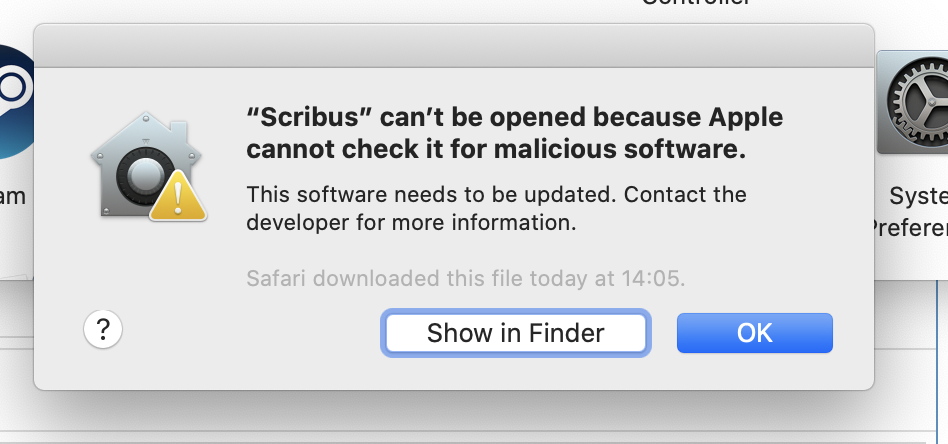 | Description | Getting error message when trying to sign in to Scribus on OSX 10.15.6. Says "Scribus" can't be opened because Apple cannot check it for malicious software. The software needs updated. Contact the developer for more information. | ||||