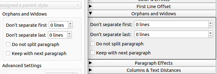 I'm not a real developer :-). It is not hard to change the order of these settings. But please consider before: - These settings are parallel on Style Manager and Text Properties dock panel > Orphans and Widows - The German translation does not follow English exactly ("Don't separate first X lines" / "Don't separate last Y lines"), although its meaning is of course the same. I think the current solution with original English labels is good. If we decide to change the order of these controls, we should be change the original English labels to: - Orphan control: X lines - Window control: Y lines Let’s see what the core developers think. |