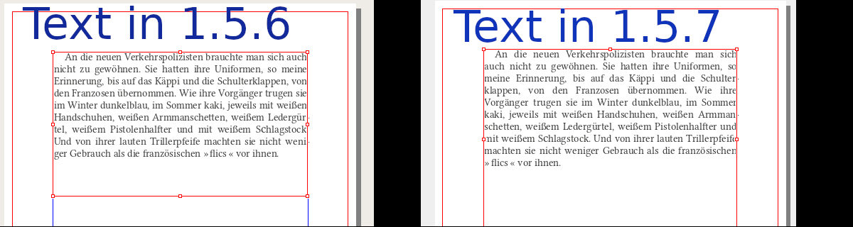 | Additional Information | The consequence of this behaviour is, that you cannot use a 1.5.6 document in Scribus 1.5.7 without reformatting the whole document. Which is very laborious in large documents like text books. | ||||
