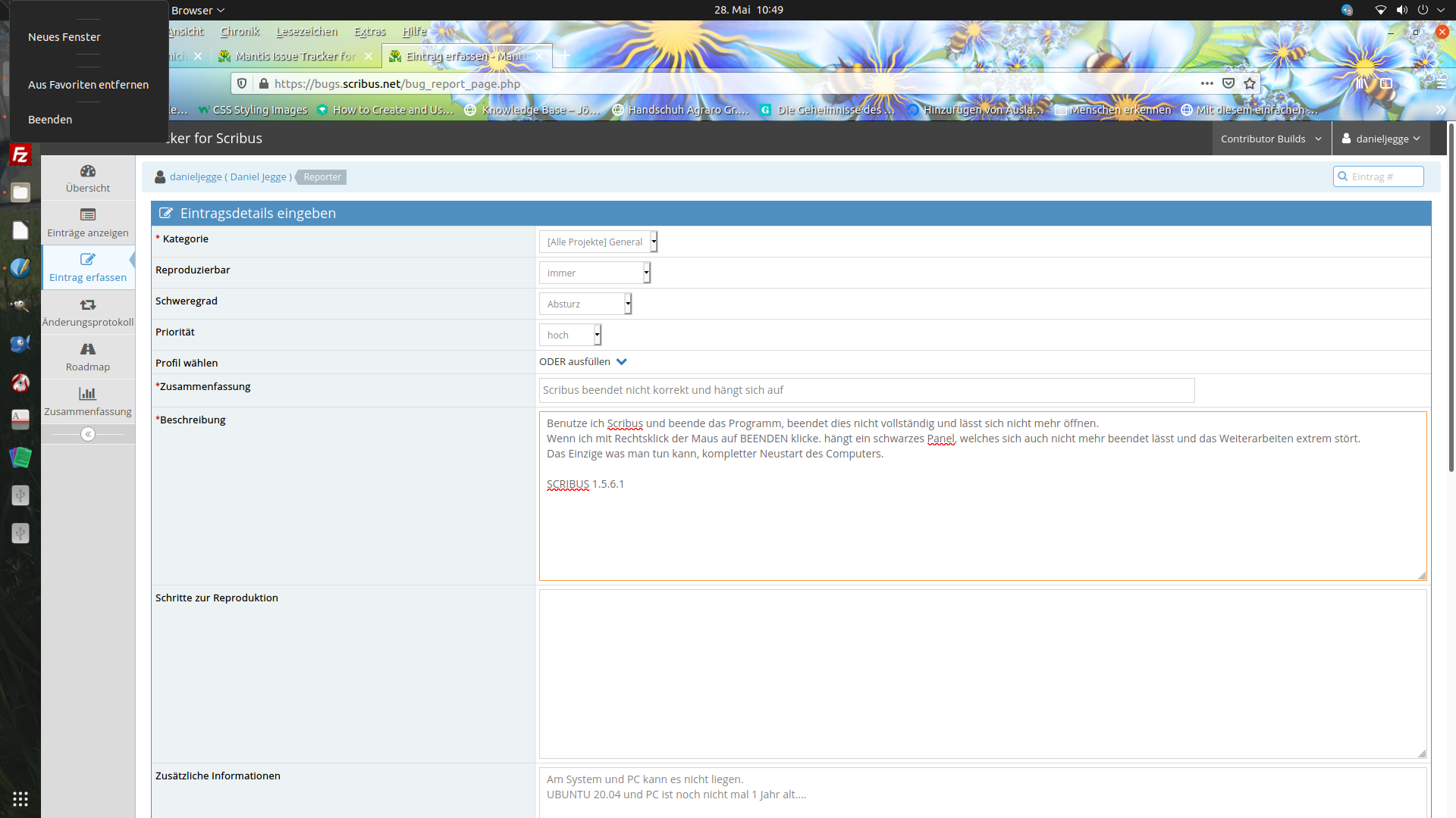 Ich öffne Scribus. Beim Beenden schliesst sich der Prozess nicht, sondern bleibt hängen. Wenn ich nun mit der Maus mit Rechtsklick auf dem Scribus-Symbol versuche den Prozess zu beenden, kommt dieses kleine Panel »Beenden, aus Favoriten entfernen, Neues Fenster« - ich klicke also auf »Beenden« Nun schon diese Funktion hängt sich auf. Der Panel bleibt nun auf dem Bildschirm und lässt sich nicht mehr entfernen. Das Programm beendet auch nicht. Selbst wenn ich den Prozess von Scribus in der Prozessverwaltung abwürge, bleibt dann der Panel auf dem Bildschirm bestehen. Einzige Lösung; Neustart des kompletten Systems. |