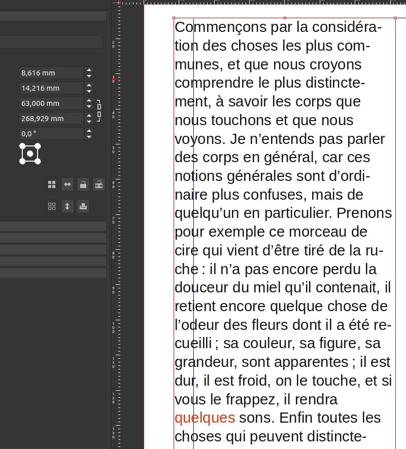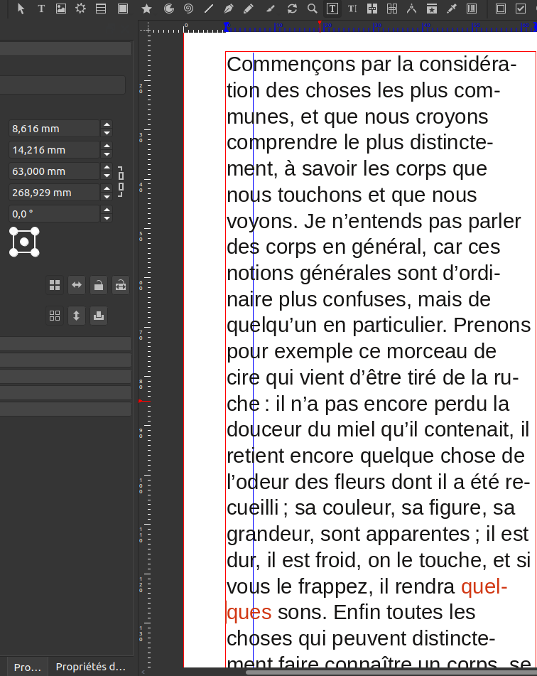 Here is a new SLA document with only one text frame in first page to keep centered on a single reproduction case (in case you wish more situations, 2nd page features more reproduction situations). On that first page, i edited the original Descarte text and changed the "quelque" into "quelques" : these are both correct common words, but hyphenation for "quelques" is "quel-ques" which cuts into 4-letters words (= longer than 3, should be even more hyphenated !) And I upload 2 screenshots - one after hyphenated is requested. See : hyphenation hasnt apply to "quelques" (but should have) - one after i apply manualy a conditional hyphen. See : cut part of the word fit perfectly at the end of the line. That's also what scribus hyphenation should produce. Screenshot also include XYZ palette with width of text frame. after automatic hyphenation.sla (30,225 bytes)