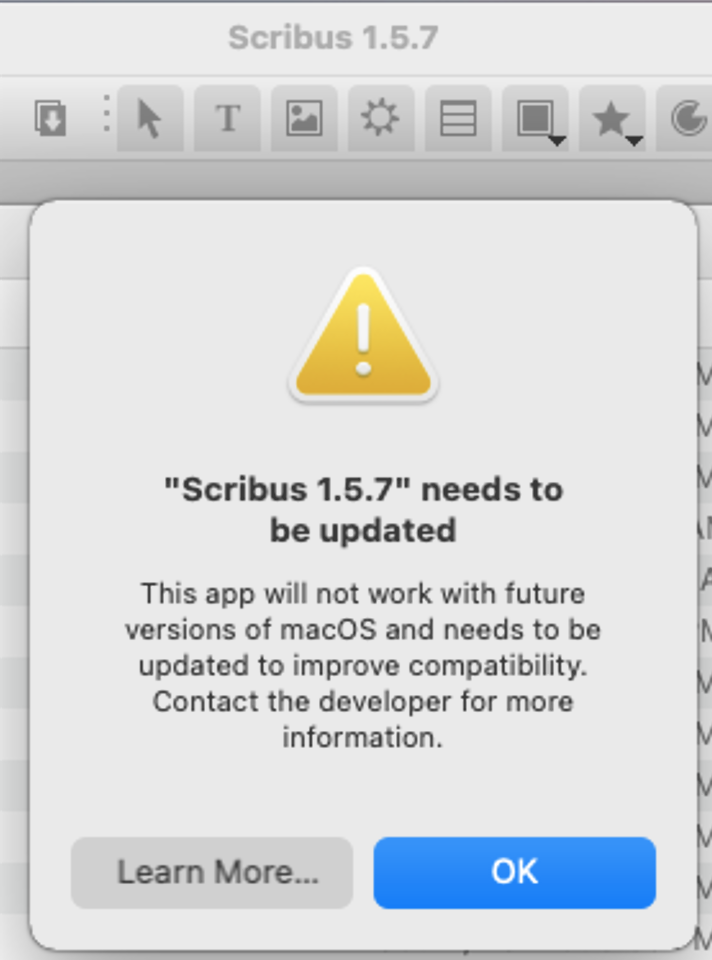 | Description | This happened first on 1.5.6 installer and then tried the 1.5.7 (both behave the same way). When I install on the latest macOS Monterey platform, and launch scribus for the first time. Im presented with an error that states: " Scribus 1.5.7 needs to be updated This app will not work with future versions of macOS and needs to be updated to improve compatibility. Contact the developer for more information". The warning has two buttons on it. 1. Learn more. 2. OK. If you press ok, it takes you into the program. If you press Learn more, it takes you to the following web browser link: https://www.python.org/doc/sunset-python-2/ attached is the image of the warning. | ||||