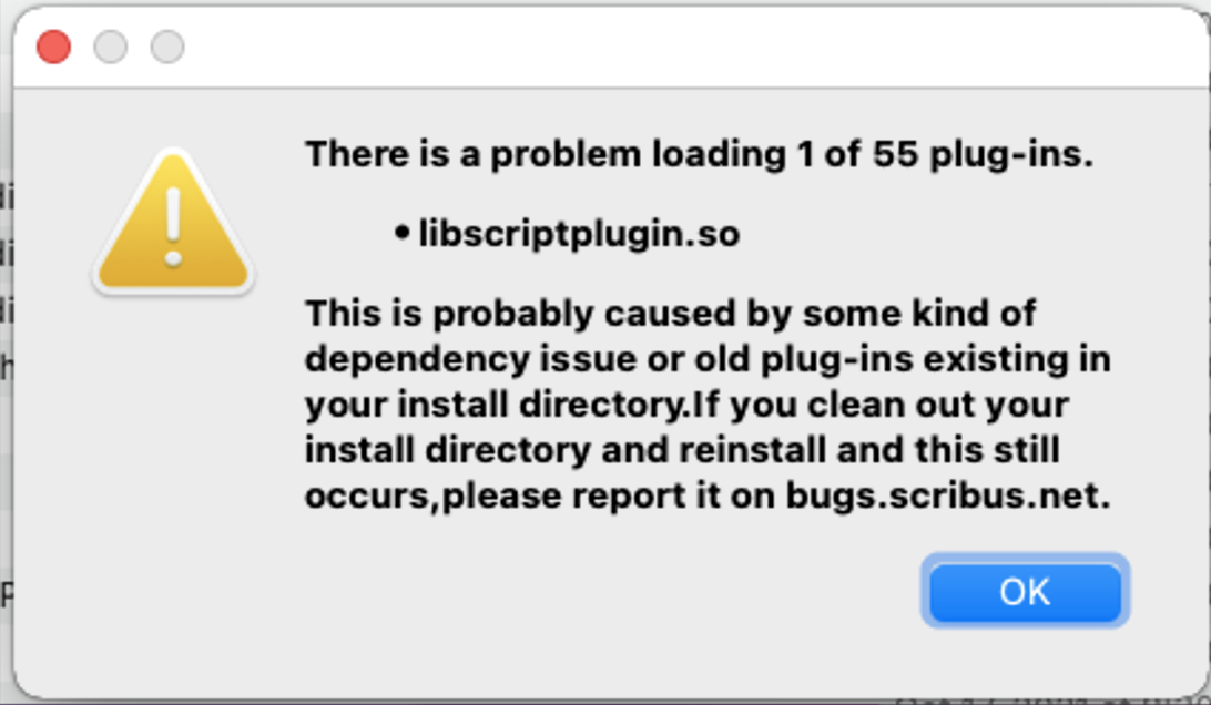 | Description | When I download and install "scribus-1.5.7-CatalinaPy3.dmg", when I launch Scribus, I get the below error. It happens every-time I launch Scribus. Pressing OK on the warning lets me into the program (did not test what works or not). " There is a problem loading 1 of 55 plug-ins. -libscriptplugin.so This is probably caused by some kind of dependency issue or old plug-in existing in your install directory. If you clean out your install directory and re-install and this still occurs, please report it on bugs.scribus.net " Im not 100% sure what it means by install directory: I did delete the scribus.app and the scribus folder located here: /Users/username/Library/Preferences/Scribus And then re-tried installing. I continue to get the same error on launch. | ||||