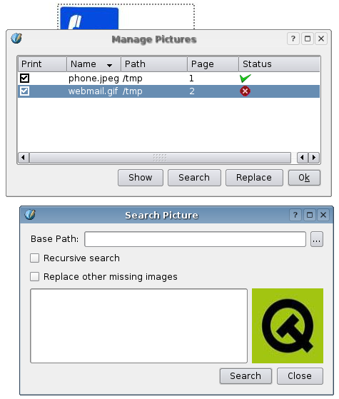 | has duplicate | 0000516 | closed | fschmid | Searching for a picture crashes scribus |