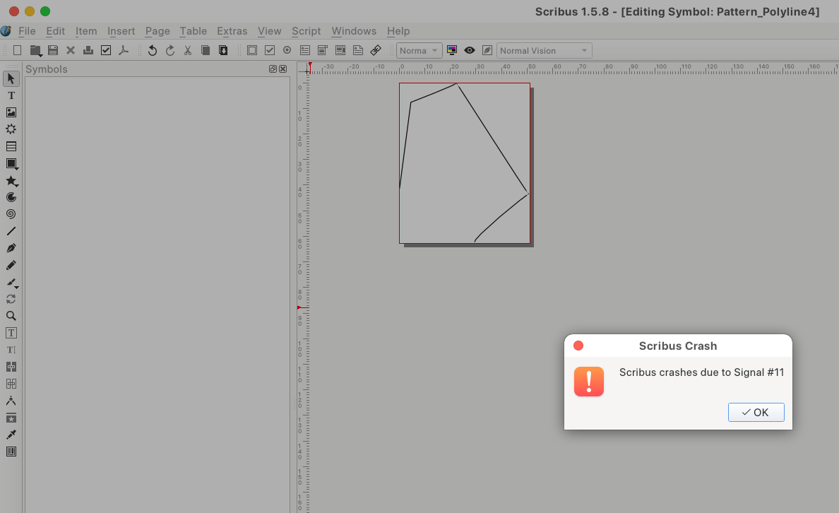 | Steps To Reproduce | 1. Create a new document and draw a random shape 2. Convert shape to symbol (right click --> Convert To... --> Symbol) 3. Double-click on symbol to switch to edit mode 4. Open Symbol Panel (Windows menu --> Symbols) 5. Remove Symbol in Symbols Panel (right click --> remove item Crash: Scribus crashes due to Signal 0000011 | ||||