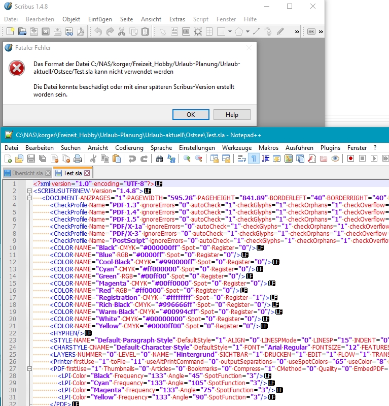 | Description | Using Scribus 1.4.8. When opening a .sla file from NAS, I'm getting the error "das Format kann nicht verwendet werden", see attached file. Opening with notepad++, shows no XML error. Even when I creat a new (empty) file, save it without doing any editing, and try to reopen it, the error occurs. It seems that scribus can't read from external NAS-Storage?? Copying to local disk helps. regards Georg | ||||