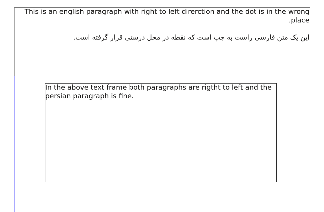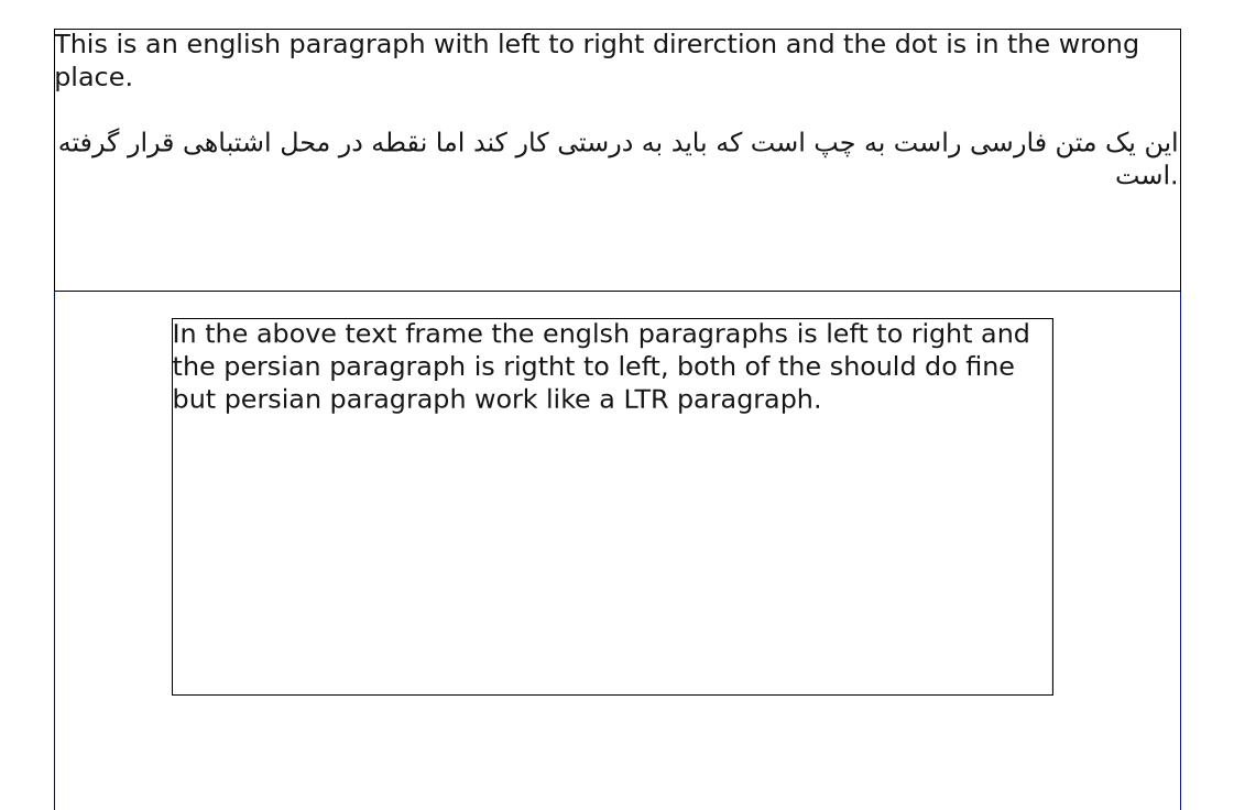 | Steps To Reproduce | Create a text frame. Type one English paragraph and one RTL language paragraph inside the text frame. Make sure you're using a right to left language while writing the right to left paragraph. put a dot at the end of each paragraph. In text properties style both of them right to left. As you can see now, dots are at the left of the last line of the paragraphs, that is correct for Persian paragraph and wrong for English paragraph. Because English paragraph ends at the left and dot should be at the end of the sentence. Now change the English paragraph direction to left to right, so the dot position on English paragraph must be fixed and it will be and as we didn't change the Persian paragraph direction so that should work fine too but it the dot will position will be at the right of the Persian paragraph that is wrong. | ||||