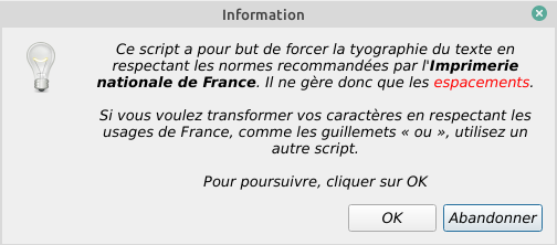 @ cbradney If you talk about extra menu for non breakable spaces, my script aims to be more precise, because this current add-on does not respect the real French typo (there are many non-break spaces in French - see my doc to understand). It is better that nothing, but if you want to publish a paper in France, and you are processionnal, you need to respect the French typo. In add, there is no way to adapt the current add-on,, which is to simple. This is the reason why I had to rewrite it. |