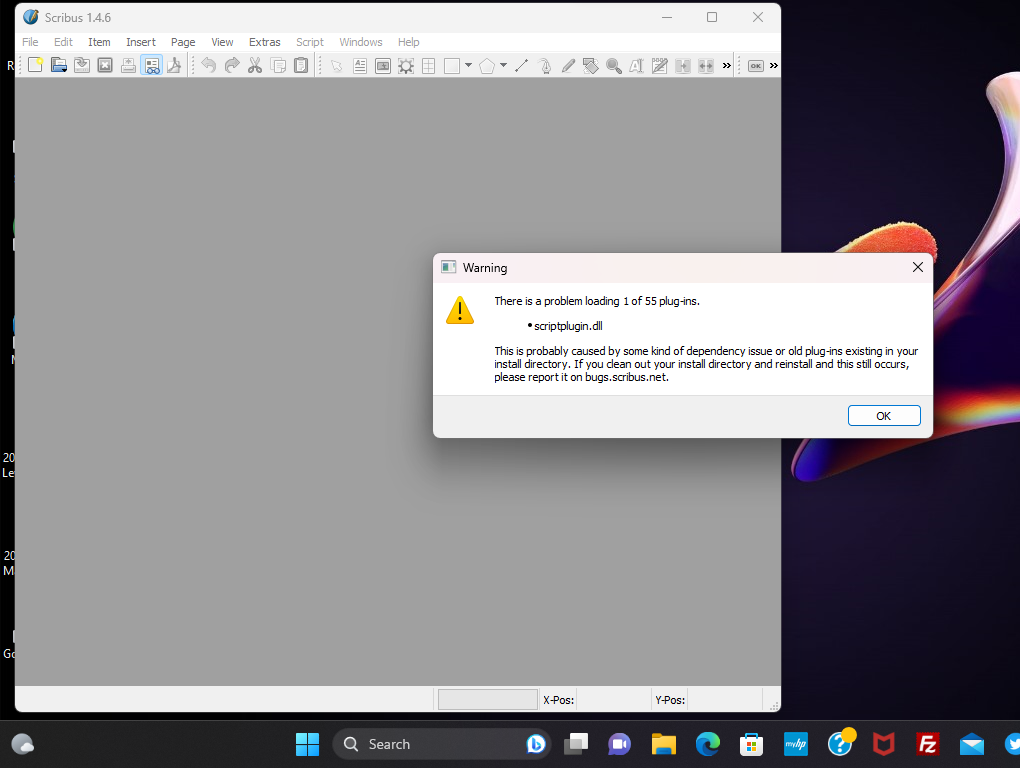 | Description | When I try to run Scribus I get a pop up that says "There is a problem loading 1of 55 plug-ins. #scriptplugin.dll This is probably caused by some kind of dependency issue or old plug-ins existing in your install directory. If you clean our your install directory and this still occurs, please report it on bugs.scribus.net." | ||||