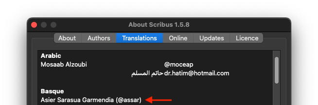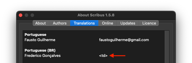 | Description | There are a couple issues in the About box's Translations tab. The contact information for Asier Sarasua Garmendia is shown right after their name rather than in the righthand column. This appears to be because there is an extra space character at the end of the line which should be removed. Looks like this issue dates back to r21010 (2016). And the contact information for Frederico Gonçalves is listed as "<td>". At first I thought this was an error in the code that generates the HTML table, but "<td>" actually appears literally in the TRANSLATION file. Looks like this issue dates back to r12531 (2008) when the manually-created HTML tables were converted to generated ones. Frederico didn't have any contact information listed prior to that. | ||||