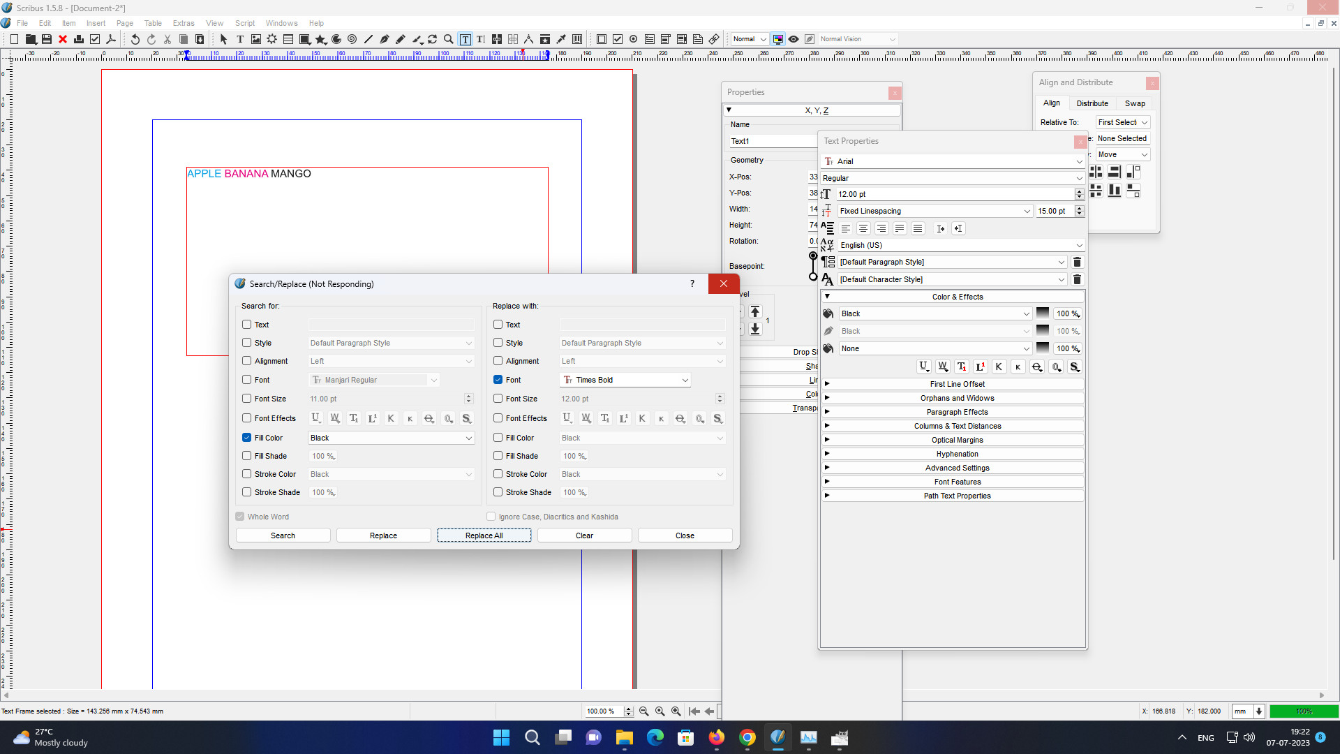 | 2023-07-20 20:50 | jghali | Summary | SEARCH AND REPLACE - all tab is not working => Search & Replace 'Replace All' hangs Scribus when searching for text color |