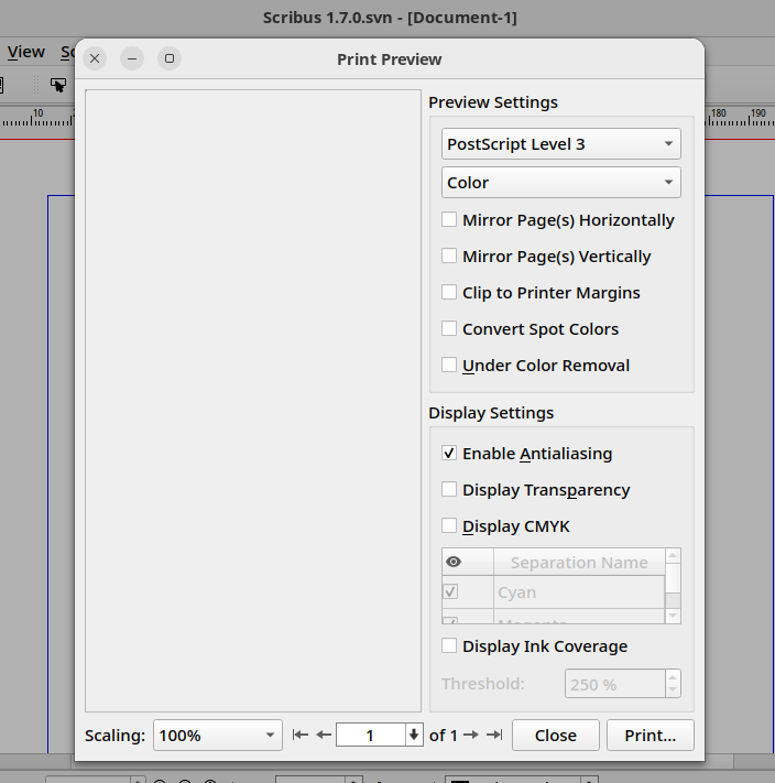 | Steps To Reproduce | 1. Start Scribus 1.7.0 svn r25616 2. Create a new document 3. Click on File -> Print Preview 4. Bug: page preview is not rendered correctly (Preview is just 1x1 px) You will see a print preview if you enable "Display Transparency" flag. In that case, the temporary preview file is a PNG instead of a TIFF. | ||||