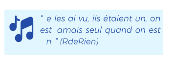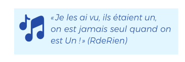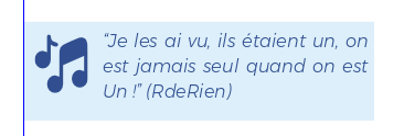 <ITEXT FONT="Montserrat Light Italic" FCOLOR="Bleu Signature" CH="on est jamais seul quand on est Un ! » (RdeRien)"/>