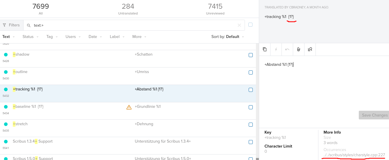 | Description | I found a strange suffix for some strings in a translation file on Transifex. This suffix has no meaning and is visible in translations when I keep it. To fix the translation, I would not add this placeholder thingy in the translated string, but it should not be there in source string. String on Transifex (String ID 5432): +tracking %1 {1?} String in source code ../../scribus/styles/charstyle.cpp:227: result += ((tracking() > 0 ? QObject::tr("+tracking %1").arg(tracking()) : QObject::tr("-tracking")) + " "); https://app.transifex.com/scribus/scribusstable/translate/#de/scribus/470718476?q=text%3A%2B | ||||
