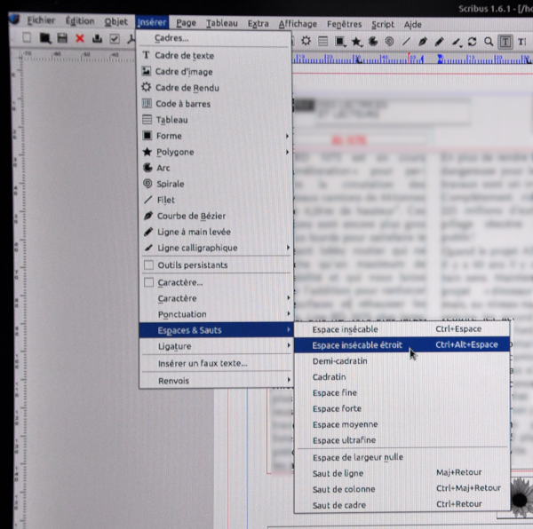 I also reported the same issue (https://bugs.scribus.net/view.php?id=17200). I don't know if the functionnality exists in other language versions, but the french one has a built-in function to insert narrow non-breaking spaces (see scrot attached). I read the comments (https://bugs.scribus.net/view.php?id=17132), which sound to me like "you, users, don't use the right unicode code" - but hey! we just click on the right place in the right menu! I precise that it worked perfectly in version 1.5.8 (I'm using 1.6.1 since one week). is there a possibility to change something (what?) manually (how?) in the code (where?). Thank you. |