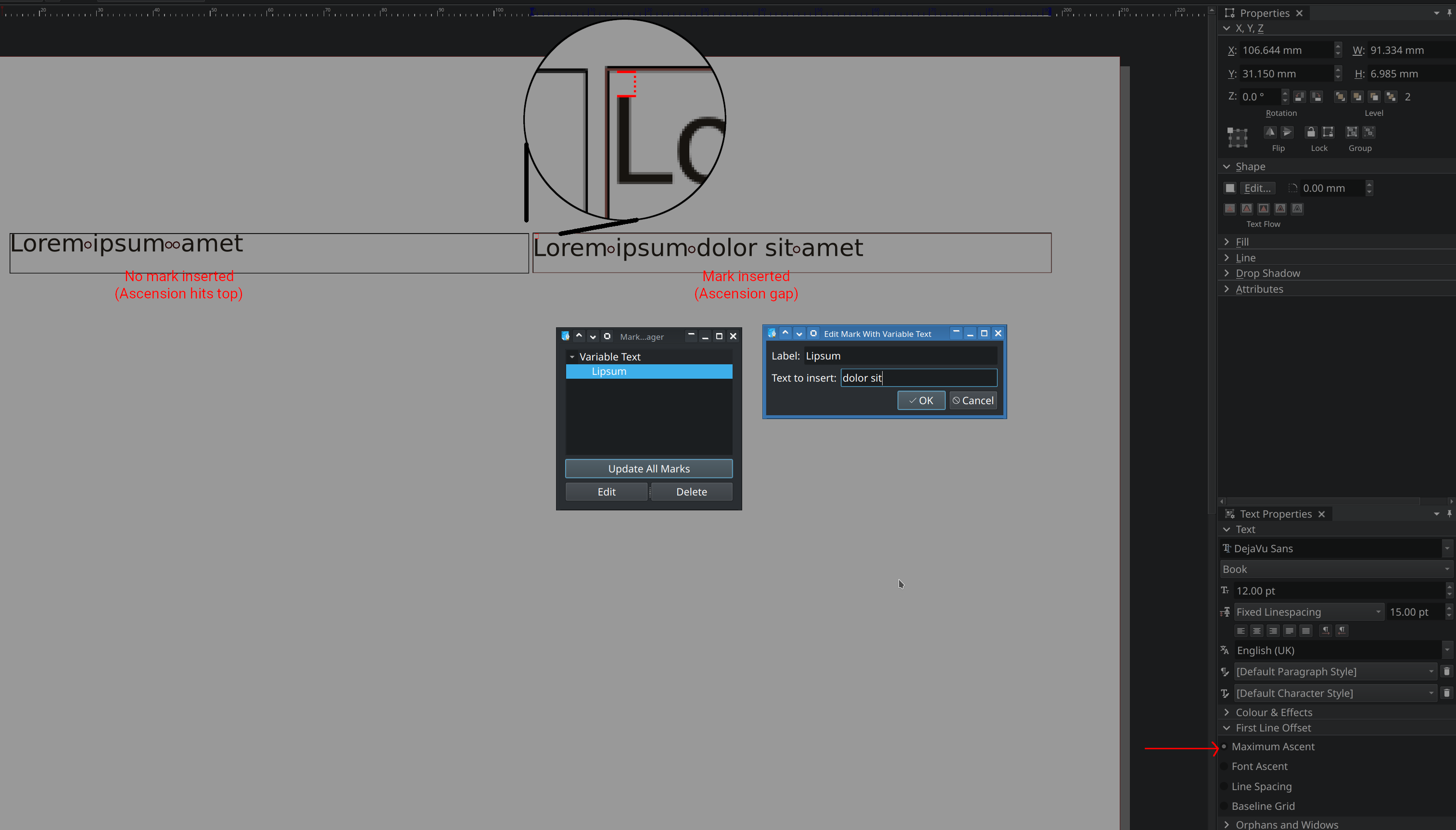 | Steps To Reproduce | 1. Create a text frame and enter some example text 2. Set the First Line Offset to "Maximum Ascent" 3. Note the text touches the top of the frame 4. Create a mark and with any text inside 5. Insert the mark in to the text frame 6. Note the text no longer touches the top of the frame | ||||